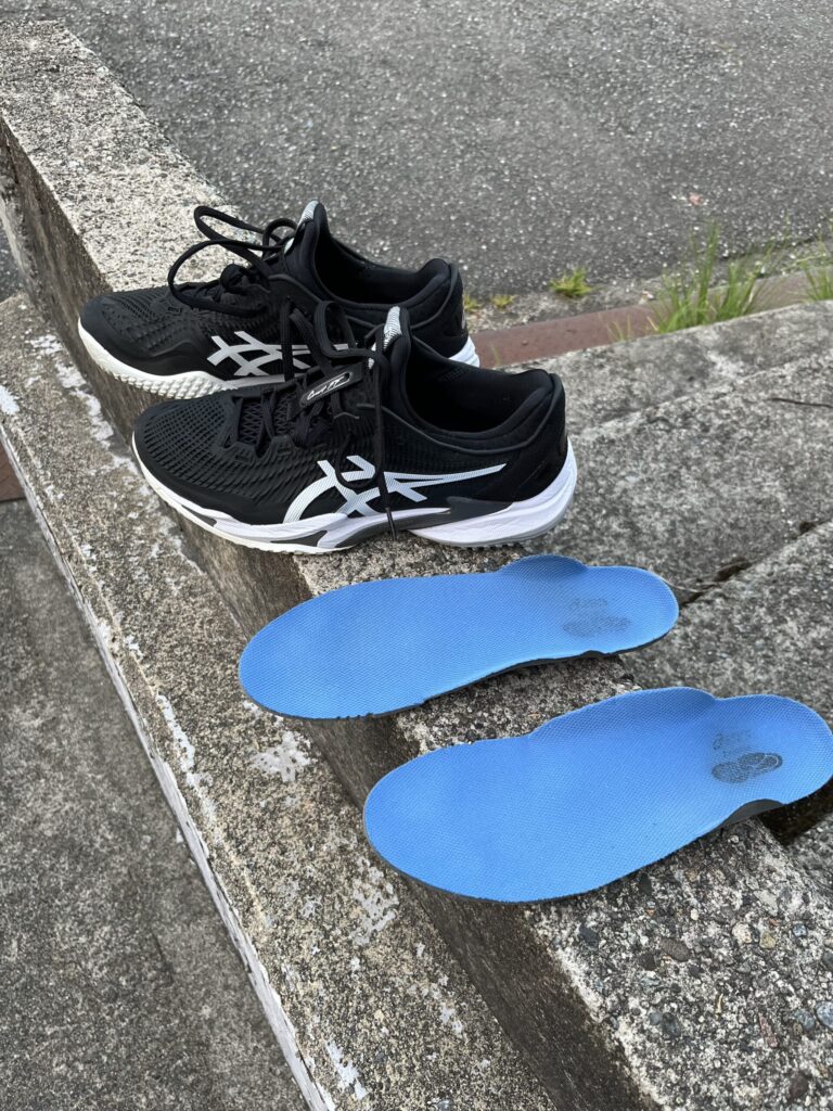 中敷はアシックスのテニス用のものにチェンジ、試合用と練習用は別のシューズにしております